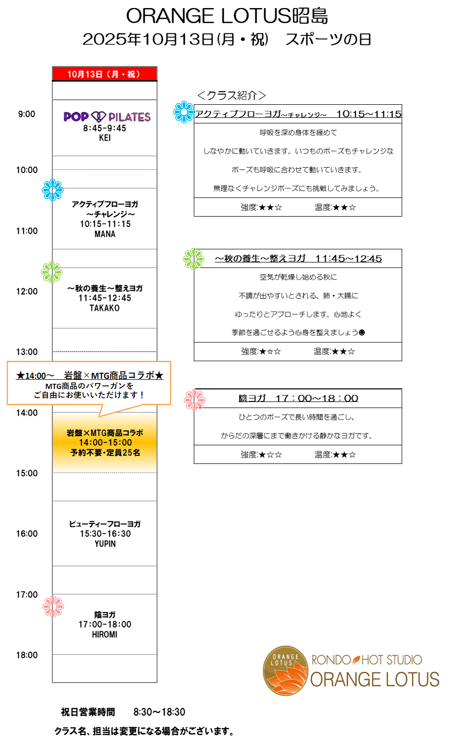 オレンジロータス昭島 10月13日(月・祝)スケジュール